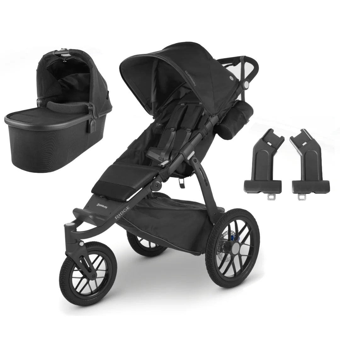 Includes: UPPAbaby Ridge Stroller (Jake) + UPPAbaby V3 Bassinet in choice of colour and UPPAbaby Ridge Bassinet adapters.
